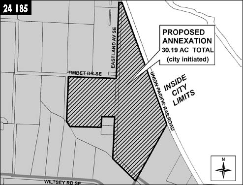 MEASURE NO. 24-185 City of Salem![]() Referred to the People By The City Council24-185 Measure Proposing Annexation of 30.19 Acres of PropertyInto Salem Question: Should the Property located east and west of Eastland Avenue SE (5800 Block) be annexed? Summary: Approval of this measure would annex 30.19 acres of Property located east and west of Eastland Avenue SE (5800 Block) to the City of Salem. The Property is within the Urban Growth Boundary. Upon annexation, the Property would be zoned City of Salem RA (Residential Agriculture). Explanatory Statement:If approved, this measure would result in annexation of 30.19 acres of territory (the Territory) to the City of Salem. The Territory is located east and west of Eastland Avenue SE (5800 Block) and designated in the Salem Area Comprehensive Plan as “Developing Residential.” Zoning of the Territory if annexed would be RA (Residential Agriculture). The RA zone district generally allows residential uses, select agricultural uses, playgrounds and parks, public buildings and child/adult care homes. The minimum lot size for single family dwellings is 4,000 square feet. This zoning designation allows a maximum density of 8 dwelling units per acre, assuming an allowance for public utilities and infrastructure. A complete description of uses in the RA zone district is available in Salem Revised Code (SRC) Chapter 145. If annexed, the Territory is estimated to have the fiscal impact of creating an annual surplus to the City’s General Fund (in year 2005 dollars) of $9002 based on development with an average density of 5 dwelling units per acre. Adequate public facilities exist to serve the Territory, in accordance with the city’s adopted budget, master plans, Capital Improvement Plan and urban growth management process as set forth in SRC Chapter 66. Additional information regarding the proposed annexation and zoning is available for public review at the Salem City Hall, Department of Community Development, Room 305, 555 Liberty Street SE, Salem, Oregon and on the City’s web site www.cityofsalem.net. Submitted by, Janet Taylor, On behalf of the Salem City Council No arguments opposed to or in favor of this measure were filed.