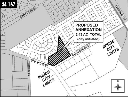 MEASURE NO. 24-167 City of Salem![]() Referred to the People By The City Council24-167 Measure Proposing Annexation of 2.43 Acres of Property IntoSalem Question: Should the Property located at and in the vicinity of 5039 Caplinger Road SE area be annexed? Summary: Approval of this measure would annex 2.43 acres of Property located at and in the vicinity of 5039 Caplinger Road SE area to the City of Salem. The Property is within the Urban Growth Boundary. Upon annexation, the Property would be zoned City of Salem RA (Residential Agriculture). Explanatory Statement:If approved, this measure would result in annexation of 2.43 acres of territory (the Territory) to the City of Salem. The Territory is located at 5039 Caplinger Road SE and designated in the Salem Area Comprehensive Plan as “Developing Residential.” Zoning of the Territory if annexed would be RA (Residential Agriculture). The RA zone district generally allows residential uses, select agricultural uses, playgrounds and parks, public buildings and child/adult care homes. The minimum lot size for single family dwellings is 4,000 square feet. This zoning designation allows a maximum density of 8 dwelling units per acre, assuming an allowance for public utilities and infrastructure. A complete description of uses in the RA zone district is available in Salem Revised Code (SRC) Chapter 145. If annexed, the Territory is estimated to have the fiscal impact of creating an annual surplus to the City’s General Fund (in year 2005 dollars) of $2,156 based on development with an average density of 5 dwelling units per acre. Adequate public facilities exist to serve the Territory, in accordance with the city’s adopted budget, master plans, Capital Improvement Plan and urban growth management process as set forth in SRC Chapter 66. Additional information regarding the proposed annexation and zoning is available for public review at the Salem City Hall, Department of Community Development, Room 305, 555 Liberty Street SE, Salem, Oregon and on the City’s web site www.cityofsalem.net. Submitted by, Janet Taylor, On behalf of the Salem City Council No arguments opposed to or in favor of this measure were filed.