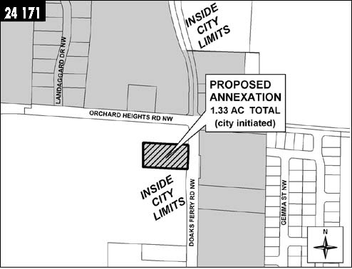 MEASURE NO. 24-171 City of Salem![]() Referred to the People By The City Council24-171 Measure Proposing Annexation of 1.33 Acres of Property IntoSalem Question: Should the Property located at 1755 Doaks Ferry Road NW be annexed? Summary: Approval of this measure would annex 1.33 acres of Property located at 1755 Doaks Ferry Road NW to the City of Salem. The Property is within the Urban Growth Boundary. Upon annexation, the Property would be zoned City of Salem RA (Residential Agriculture). Explanatory Statement:If approved, this measure would result in annexation of 1.33 acres of territory (the Territory) to the City of Salem. The Territory is located at 1755 Doaks Ferry Road NW and designated in the Salem Area Comprehensive Plan as “Developing Residential.” Zoning of the Territory if annexed would be RA (Residential Agriculture). The RA zone district generally allows residential uses, select agricultural uses, playgrounds and parks, public buildings and child/adult care homes. The minimum lot size for single family dwellings is 4,000 square feet. This zoning designation allows a maximum density of 8 dwelling units per acre, assuming an allowance for public utilities and infrastructure. A complete description of uses in the RA zone district is available in Salem Revised Code (SRC) Chapter 145. If annexed, the Territory is estimated to have the fiscal impact of creating an annual surplus to the City’s General Fund (in year 2005 dollars) of $1,182 based on development with an average density of 5 dwelling units per acre. Adequate public facilities exist to serve the Territory, in accordance with the city’s adopted budget, master plans, Capital Improvement Plan and urban growth management process as set forth in SRC Chapter 66. Additional information regarding the proposed annexation and zoning is available for public review at the Salem City Hall, Department of Community Development, Room 305, 555 Liberty Street SE, Salem, Oregon and on the City’s web site www.cityofsalem.net. Submitted by, Janet Taylor, On behalf of the Salem City Council No arguments opposed to or in favor of this measure were filed.